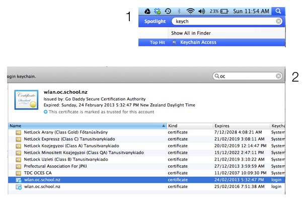 The ‘certificate’ page is where you need to give a file to the Apple TV box to say the network and Apple TV are following the same ‘rules’ when talking. This part is the trickiest. On the mac, join the wireless network and you will get the Certificate file. To find the file you can use the Mac’s Keychain Access (1 use Spotlight to find that!) and search for the wireless name (2). See pic below.